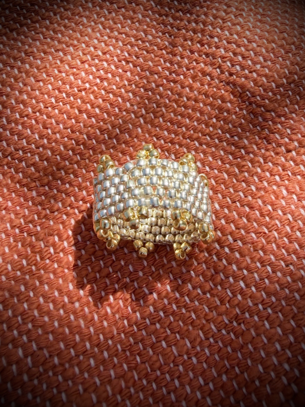 De ring is gemaakt van kleine glaskraaltjes op elastiek.Materiaal glasktaaltjes & elastiek.